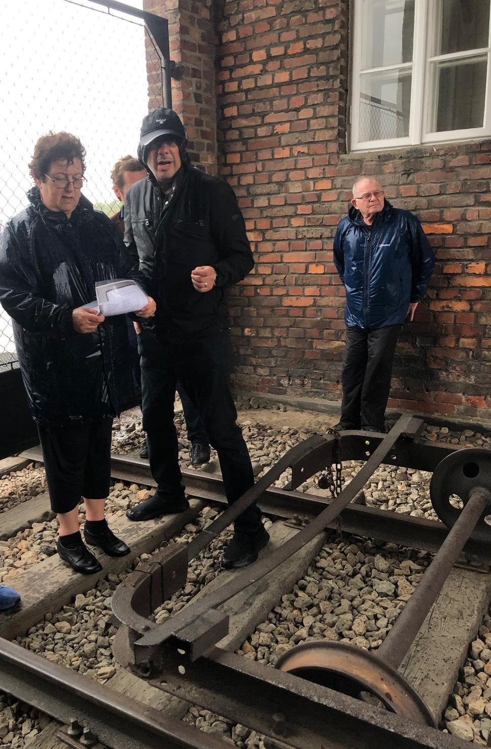 After a snack at the canteen, we took the tour bus to Birkenau, the largest of the more than 40 camps and sub-camps that comprised the Auschwitz complex. The rain was coming down heavily now so we took shelter and recited Kaddish for Naftali Rosenblum, who was married to Cesia Suknik (daughter of Josek Suknik and Mariem Zmidek) and had emigrated to Belgium in 1930. Naftali was captured by the Gestapo in 1944, deported to Auschwitz, moved to Gross-Rosen and later to Buchenwald, where he died in April 1945.